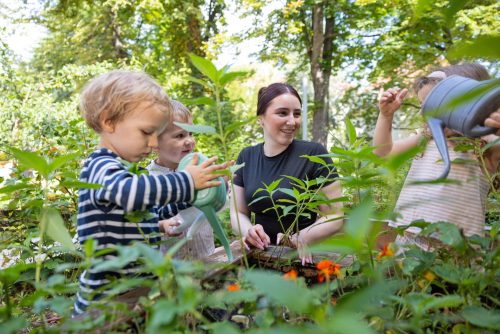 Im Atelier stehen ihnen verschiedenste Materialien zur Verfügung, in der kleinen Lernwerkstatt oder in der Bücherei machen die Kinder erste Erfahrungen mit Buchstaben, Zahlen und Formen. Spielerisch setzen sie sich mit Mengen, Größen und naturwissenschaftlichen Zusammenhängen auseinander. Der großzügige Garten mit seinem alten Baumbestand ermöglicht durch viele Schattenplätze und Rückzugsmöglichkeiten zu jeder Jahreszeit ein ungestörtes Spiel.