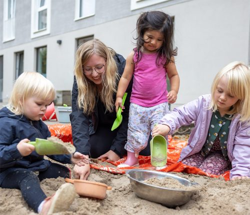 Seit Sommer 2018 können bei uns 77 Kinder ab dem Alter von acht Wochen bis zum Schuleintritt eine glückliche Kindergartenzeit verbringen. Die Kinder finden vielfältige und kreativ gestaltete Räume, die Perspektivwechsel zulassen, ihnen Spaß machen und sie jeden Tag aufs Neue herausfordern. So passiert das Lernen praktisch nebenbei.